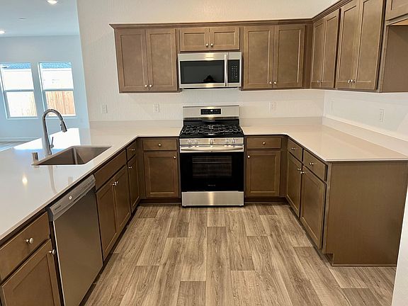 Be the First one to live in this beautiful home with an open layout shared between the kitchen, dining room and Great Room for easy entertaining. There are four bedrooms, including a private owner's suite, complete with an en-suite bathroom and walk-in closet, making this home ideal for growing households. A convenient two-bay garage has quick access to the home's entry.. This home is designed for durability and style, with water-resistant vinyl plank flooring in high-traffic areas like the entryway, living room, dining room, and kitchen. A chef-inspired kitchen awaits, boasting a spacious island, gleaming white quartz countertops, and an oversized walk-in pantry for ample storage. Stainless steel appliances, Lovely kitchen cabinets with soft closing that makes the kitchen admirable.