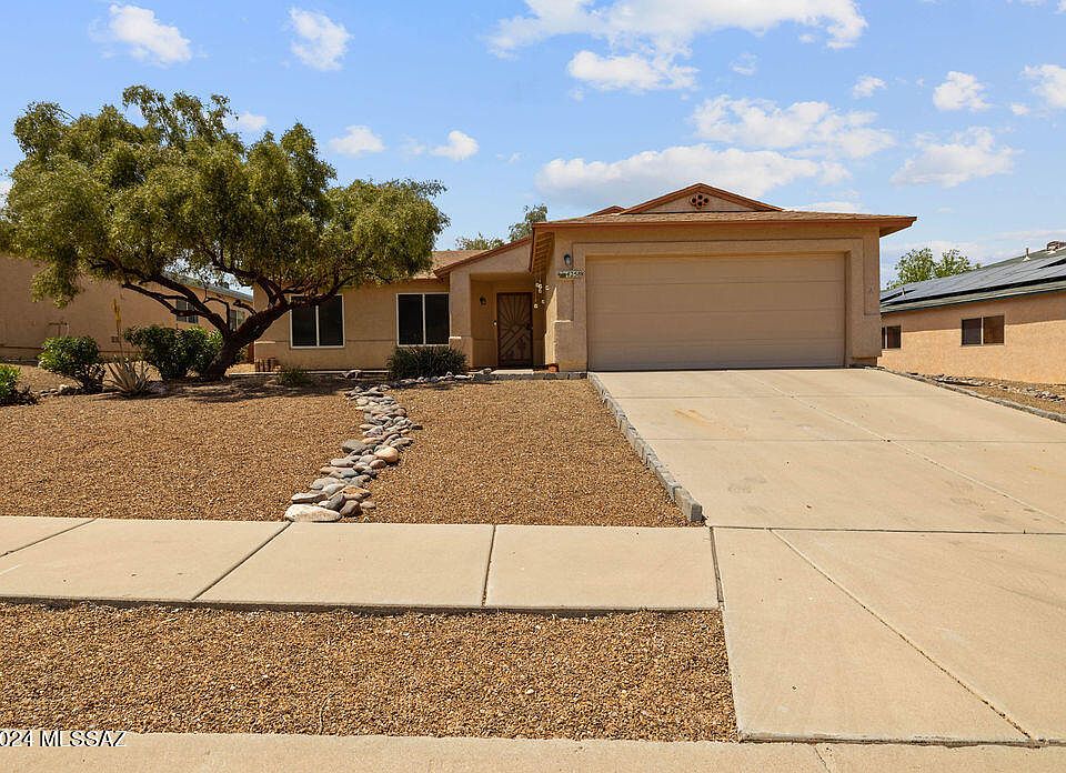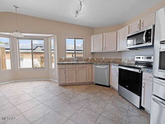 Move-in ready and well maintained 3 bed, 2 bath home with a LARGE backyard in East Tucson! The kitchen and bathrooms have granite counters, with ample cabinet space and dual vanities in the primary bath. Large 18''diagonal tiles in all the high traffic area. Kitchen also has newer Whirlpool refrigerator, oven/stove, microwave and dishwasher. Vaulted ceilings! Backyard is complete with mature citrus trees, garden beds, and room to add your own touch! Enjoy additional privacy on this elevated lot, sitting higher than back neighbors. Move-in ready and well maintained.