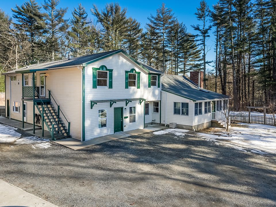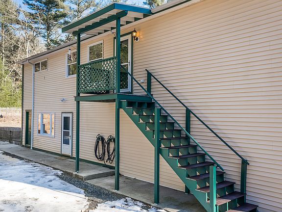 Unique 2 family home nestled on just under 2 acres of land surrounded by tall pines. Privacy galore! This unit, with heat and electric included, offers two floors of living space with an open floor plan, living room with vaulted ceilings, wood burning stove, large open kitchen with sliding doors leading to a huge 9 X 32' deck with awning overlooking secluded yard, dining room, guest bedroom, full bath, spacious master suite with huge windows overlooking backyard, built-in armoire, walk-in closet, and full bath. This unit also offers an office enclave off the living room with built in half round desk. Stairs lead down to a 26 X 19' bonus room with French doors opening to first floor patio. Brand new appliances. Owner is a licensed realtor. Application Fee required. Owner pays for water, heat, and electric. First and last months rent is due at signing. No smoking allowed. Small pets permitted.