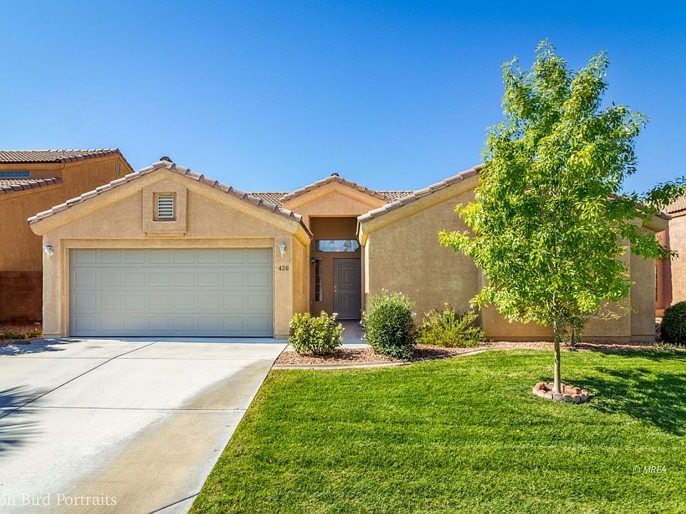 Located in the Gated Community of Copper Bluffs. Outdoor living in this backyard is really easy !!! Large Covered Patio enables outdoor entertaining for a number of people "easily". Backyard is fully fenced by a block wall and has many colorful bushes....very low maintenance. Just step inside this home and you see "ALL TILED" entryway, living room, dining area and kitchen....makes for cool living in the desert. Living Room has sliding glass doors that take you straight out to the patio for en extended entertaining area. This floor plan offers two separate dining areas....so much room for family and friends to gather. Master Bedroom entryway has french doors, walk-in closet and a sliding glass door leading out to the patio as well. Guest Bedrooms are both located close to the guest bathroom. Guest Bedroom # 2 has a large walk-in closet with a large window that brings in lots of natual light. Homeowners in Copper Bluffs Subdivision enjoy the right to use the pool, hot tub, tennis courts and workout facility at the Mesquite Vistas Sports Complex.