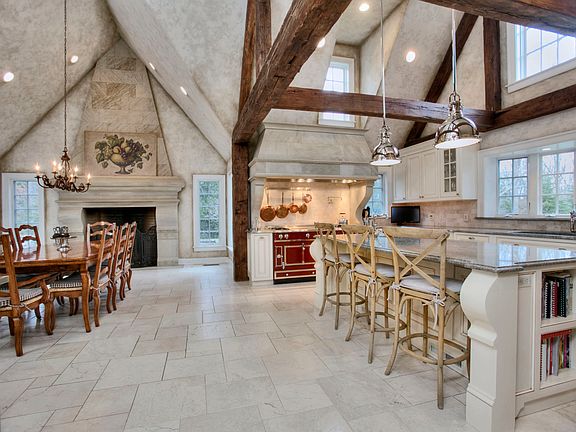 Custom built French-inspired Chateau of exceptional quality with slate roof, copper gutters, pool with waterfall spa and pool house. Dramatic soaring ceilings, hand-hewn beams, leaded glass windows and the home's architectural centerpiece, a stunning wrought iron staircase impressively gliding to the third floor. Bright formal living room made for entertaining with striking floor-to-ceiling stone fireplace, gourmet kitchen with LaCornue Stove, adjoining breakfast room with custom designed mantel fireplace and large wetbar/prep space. Formal dining room with vaulted ceiling and gas fireplace, family room with beams, fireplace and French doors leading to a cheerful sunroom. First floor master suite with sumptuous spa bath and a large bonus room with wetbar. A one-of-a-kind masterpiece.