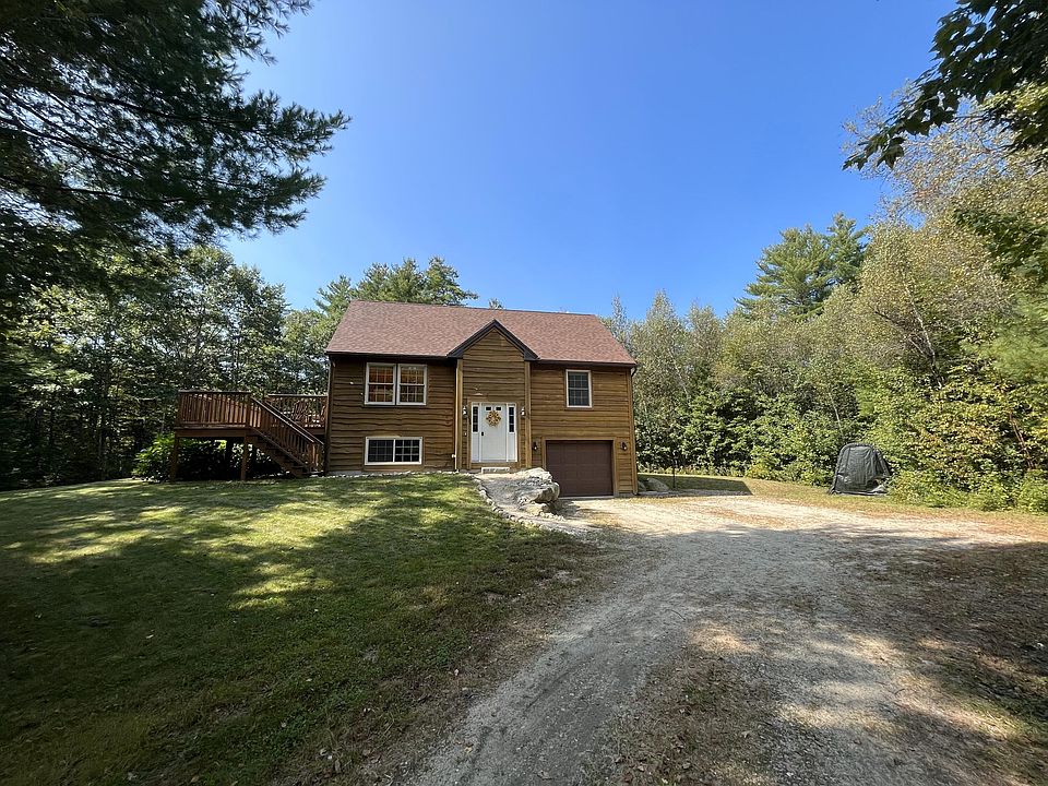 Welcome to your piece of paradise! Located in a private gated community. This well maintained live-edge cedar sided home has a rustic feel and is tucked into the woods for privacy. This home sits on 22.75 acres and has 260' of water frontage on the private Notched Pond. You may put a dock in for swimming, kayaking or paddle boarding. Your own wild blueberry bushes await you along your private waterfront. Blueberry bushes can produce several gallons of berries each year. There are many maple trees on the property for tapping your own sap as well. Plenty a bird sightings be had, bald eagles, loons, osprey, cedar waxwings, and even a great blue heron drops in every year. As you enter, you may go down to a daylight finished basement that may be used as a bedroom or extra living space. On the main floor you will find two bedrooms a full bath, open living space with living room and kitchen. A wall of windows boasts views of your oversized deck for your outdoor enjoyment. Granite countertops and stainless appliances upgrades your kitchen space. Finished loft space overlooks the living area with the coolest library stairs, let your imagination run. Already has a half bath and is plumbed for a shower or tub. All of this within 10 minutes from the Gray turnpike entrance.