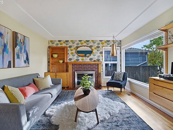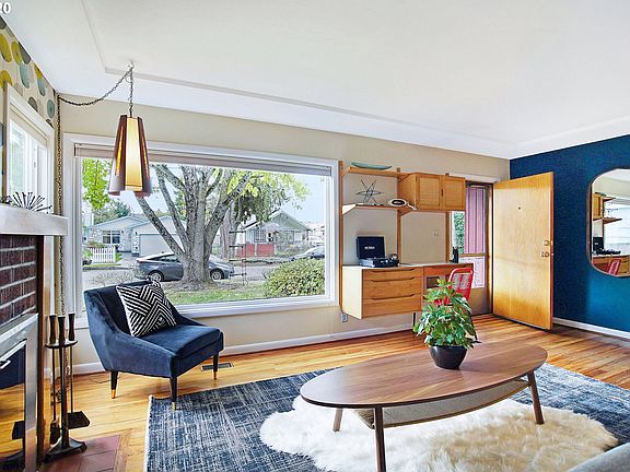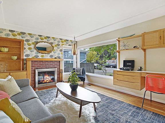 This mid-century Montavilla home has a well laid out main floor with updated bathroom, cozy kitchen and light drenched front room complete with natural wood built-ins, fireplace and stylish wallpaper. Direct access to a luscious back yard full of mature plants and edibles. Yard provides tidy areas to lounge and entertain at a distance and Gdn shed. Surprising basement with light filled family room, storage, laundry and a workshop One car garage and additional off street parking in the drive. [Home Energy Score = 7. HES Report at https://rpt.greenbuildingregistry.com/hes/OR10187628]