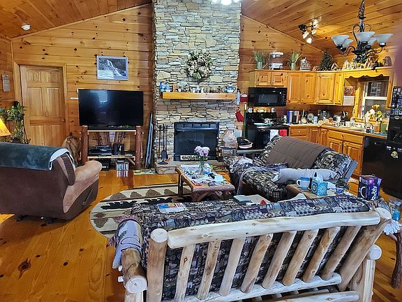 Welcome to 426 Oak Sky Way in The Oaks! This beautiful newly remodeled 2 bedroom, 2 bath log cabin offers a quiet setting and peaceful surroundings. Step inside and you're greeted by soothing natural wood tones throughout. The open and spacious floor plan provides you with the perfect entertaining opportunity, or to just enjoy the company of your friends and family. The living room boasts a massive floor to ceiling cultured stone fireplace and a soaring cathedral ceiling overhead. The adjoining kitchen provides black accented appliances and natural wood cabinetry. Located just off of the living area, you will find the master suite bedroom. This bedroom offers the continued natural wood accents and a full en-suite bath for added privacy and convenience. Another great feature of this log cabin is the additional bedroom located off of the kitchen area. Here, you can let your imagination run wild and use it for whatever your personal needs may be. The 2nd bedroom features outdoor deck/hot tub access and an en-suite full bath. Step outside at this mountain cabin and enjoy the large 0.78 acre lot that backs up to a hidden pond in the woods. The rear covered deck boasts ample space to enjoy the outdoors and a newly updated hot tub. This log cabin has been used as a primary residence, but can easily be converted into a vacation rental. Remodel includes 2nd bedroom/bathroom, new stain, new fencing along drive way, and the master bathroom. A new HVAC system was installed in 2020. A new roof and replacement windows were installed in 2023.