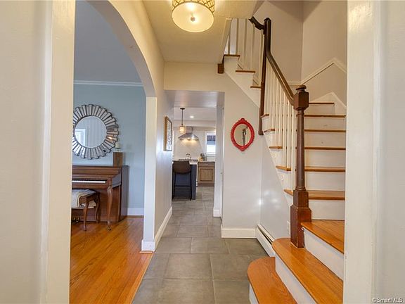 Enjoying living in this quintessential New England brick colonial home on Ridge Rd. Home features charming character mixed with tasteful updates, formal living room with hardwood floors and fireplace, leading to the formal dining room which is open to the large eat-in kitchen. The kitchen features new wood cabinetry, a two-tone island, open shelving, plenty of storage space mixed with tile backsplash, and stainless appliances. A cook's dream with a gas stove and vented hood, along with marble and granite counters. Sunroom off the back of the house has views for miles of the Glastonbury hills and is fully heated. On the middle level, you'll find the family room which is also the 4th bedroom, it offers wood paneling in keeping with the taste of the home and views. The upper level has 3 bedrooms and a full bath. The attic is completely walk up and could be finished into additional living space or even a master suite depending on your ideas. The basement is unfinished but walkout which leaves room to expand the sq ft in the future. The attached 2 car garage is also available for entry through the basement. The yard is fully fenced and tiered to be flat, great for gatherings, or play. For entertaining, there is a paver patio and a full deck. The exterior of the home is a solid brick and gives charm and ease of maintenance. Overall the homes energy efficient with insulation, and gas heat/hot water.