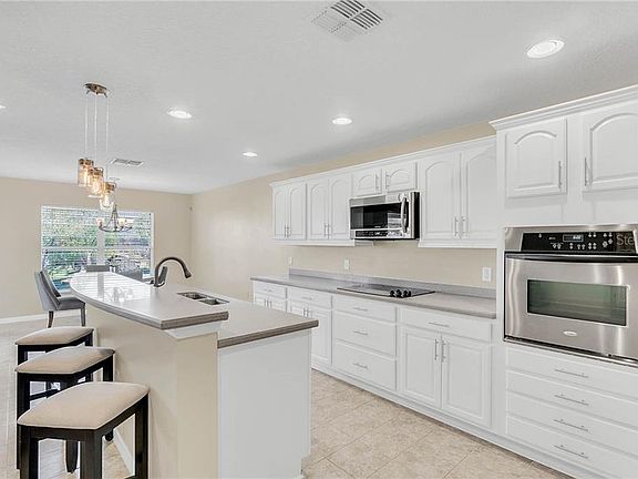 Wow! That is what you will be saying once you see this beautiful 5 bedroom 3 full bath home. Brand new HVAC inside and out in June 2018. As you enter, you are greeted by the light and bright living and dining rooms with upgraded ceiling fan and light features plus high end laminate flooring. Gorgeous kitchen with an abundance of soft close cabinets and solid surface counter space complimented by all the stainless steel kitchen appliances including cooktop and built-in oven. Edison pendant lights over the island and eat in nook for breakfast table, all overlooking the spacious family room. Huge master suite includes double sink vanity, walk-in closet, tub and separate shower. Secondary bedrooms include walk in closet. Tremendous loft perfect for a media room, play room or game room. Additional interior features include full bedroom and bath downstairs plus indoor laundry. Exterior features "Ring" doorbell, new sod (May 2019) in front lawn, plus extended covered patio. Location benefits include being just minutes away from the up and coming Champions Gate Town Center, Posner Park entertainment and shopping complex and the Northeast Regional Park which features multiple sports fields, dog park, jogging trails, fish dock, and boat launch to beautiful Lake Davenport. Easy access to I4, SR 429, and SR 417.