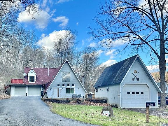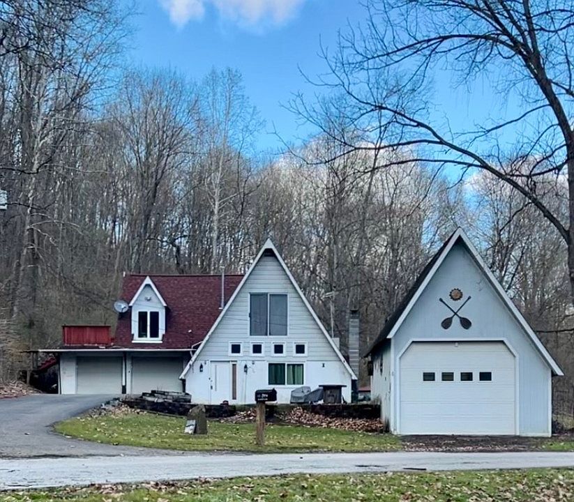 One of a kind! A-Frame home located in a peaceful and private country setting, with beautiful views! The main floor hosts the living room with built-in shelving, tons of natural light beaming from skylights, dinning room, adorable eat-in kitchen with brick fireplace, and bedroom with access to the master bathroom. Two stairways to 2nd story (kitchen and dining room). Upstairs you will find the huge Master Bedroom Suite with bathroom, window seat, and access to deck, and two other bedrooms, one with beautiful cedar woodwork. Brand NEW roof in 2022. Fenced-in backyard with patio leading to the large outbuilding. Two car attached garage and another oversized detached garage to give you even more space! Make this one yours and enjoy the wildlife!!