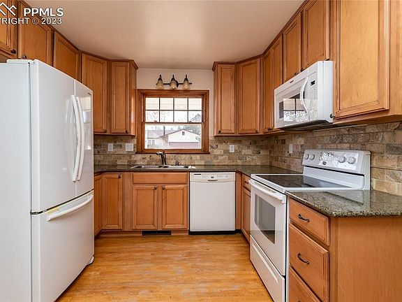 Nice brick rancher is in a great neighborhood close to Fort Carson, Downtown, and I -25. The home features all hardwood floors on the main level and all new carpets on the lower level. Granite countertops in the updated kitchen. The floor plan is open with the living room, dining room, and kitchen all connected for a nice flow for entertaining. Enjoy 2 wood-burning fireplaces one in the living room and one in the family room. Three large bedrooms upstairs and two large bedrooms downstairs in the walk-out basement. Enjoy the large deck for summer barbeques while taking in the views. Enjoy this nice neighborhood for taking walks in the Colorado fresh air with views down every street.