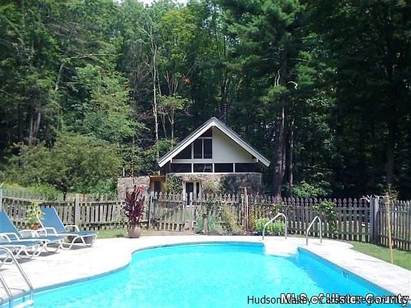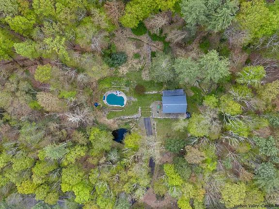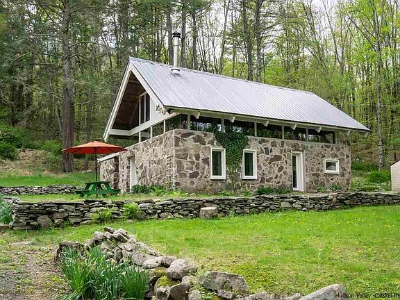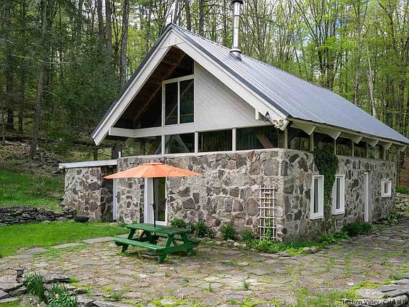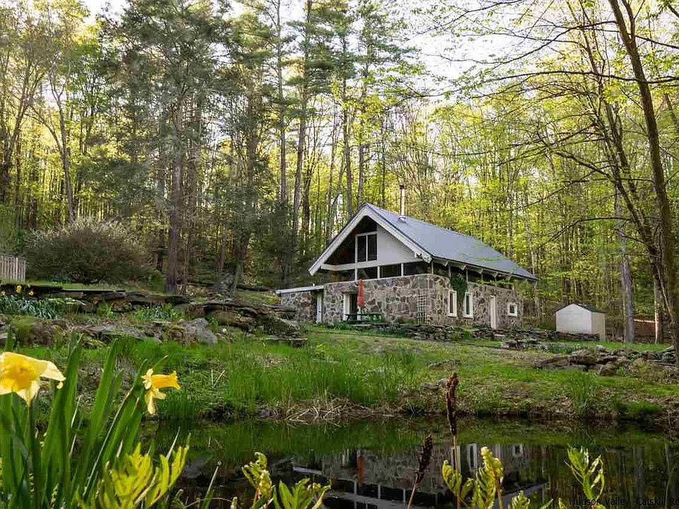 Rare contemporary stone house on 7 acres with pond, in-ground pool and lots of privacy. The downstairs features a large, open plan living, dining, and kitchen area, as well as separate guest quarters with bedroom, full bath, and direct access to outdoors and the pool. There are two loft-like bedrooms and one bath on the second level. Even though the wood-stove heats the main house while you're there and keeps it cozy during the winter, there is a state-of-the-art propane fired hot water baseboard heating system. The pool is awesome, completely private and close enough to the house so you can easily carry drinks, food etc to and from. There are spots for hammocks and a terrace for garden furniture, plenty of space to park cars and a good amount of lawn to play.
