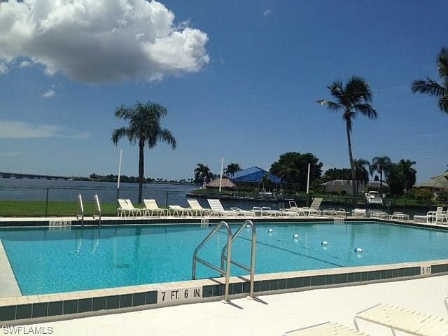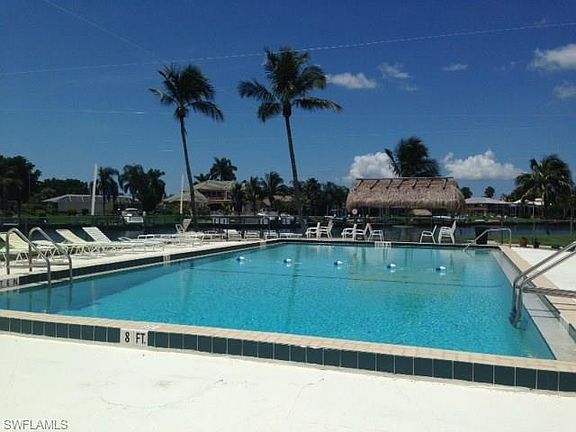 ***SIMPLY STUNNING***Enjoy the beautiful "SUNSETS" while enjoying a cocktail from your lounge chair!! Overlooking Intersecting Canals and the Caloosahatchee River. This "END UNIT" has it all!!Light , bright, and cheerful condo comes TURN-KEY!! Decorated by an "Interior Designer". You can relax the day away pool-side overlooking the River and/or enjoy your lunch under the TiKi Hut. Enjoy playing shuffle board you can here.There is a 10 x 10 storage unit along with a reserved parking spot which this unit has the "PRIME" spot. Your friends can come to visit by boat and dock at the community spaces available. Boat Slips Available First come First served. Walking distance to Jaycee Park. Close to shopping and dining too. Call now !!