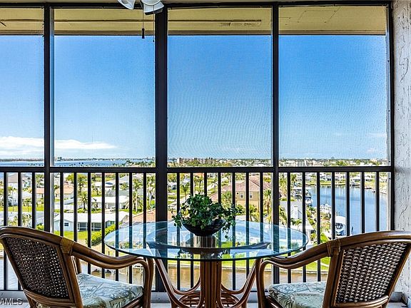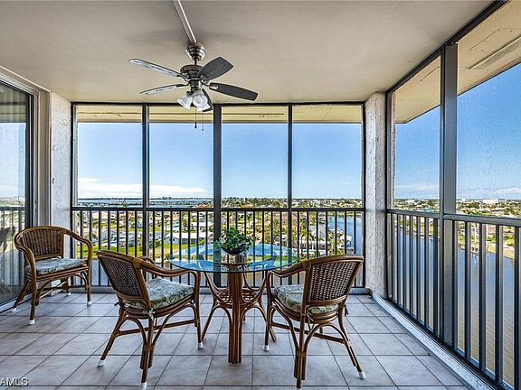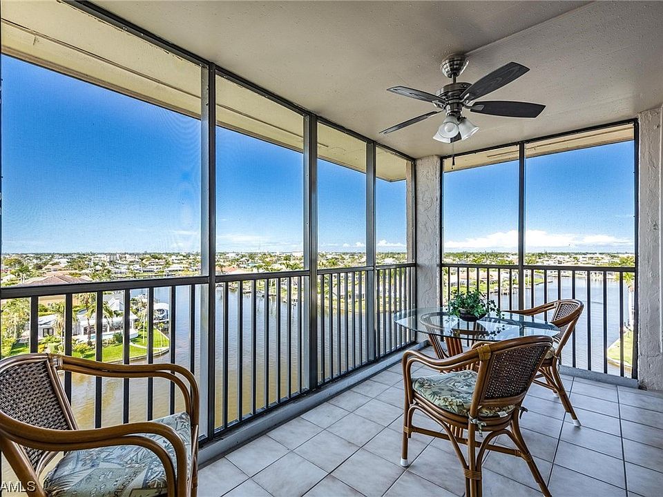 One of the most desirably located condos in River Towers! 8th floor end unit in the West building, overlooking the intersecting canal and stunning views to the river. Offering hurricane rated windows in the kitchen, dining and living area as well as a corner screened lanai! Sunsets are spectacular! Well maintained and cared for, this 2 bed, 2 bath condo is light and bright, has carpet and tile, comes fully furnished/turnkey and can be moved into right away! Guest bath shower has been updated. AC 2019. Stacking washer/dryer in your condo. HOA dues are $459/mo, includes cable and water, comes with a 10x10 storage room, reserved parking spot, additional community laundry facilities, a library and community rooms. River Towers offers one of the best locations for a pool as well! Overlooking the river with the Cape Coral Bridge in view, relax your day away around the pool or watch the dolphins play while sitting under the tiki watching the sun set. Located just steps away from Jaycee Park and close to shopping and dining! 55+, no pets allowed, no smoking development, no rentals w/in 1st 3 years of ownership.