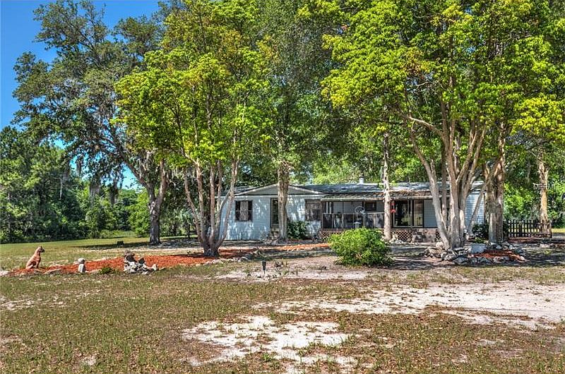 BIG PRICE REDUCTION!!! $5,300 NEW ROOF CREDIT!! Nestled between the trees and two ponds rests this gem with gentle breezes and nature's sweet sounds. A 3 bedroom, 2 bathroom double wide home on 8+ fully fenced acres. Nicely kept home with no HOA!! Lots of peaceful space to bring your pets and horses with 3 small outbuildings. There is an outdoor deck and a screened lanai upon entering. A very spacious kitchen with lots of cabinets for storage and countertops to work on including a movable center island and eat in kitchen space. The dining room has laminate flooring and is adjacent to the living room. The living room has a lake view. The real wood burning fireplace is the focal point of the room where many can gather around and enjoy the views. The master bedroom has a walk-in closet and a large bath with double sinks, garden tub, and separate walk-in shower. There is an indoor laundry off of the kitchen with lots of utilitarian space for essentials. Two other bedrooms and a guest bath. Come peek at what this property and its surroundings have to offer your family.
