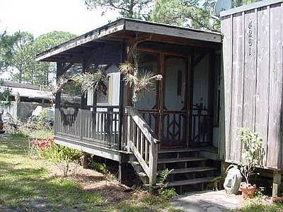 1/2 acre pie shaped lot with a private rear yard that has 1 storage shed with roofed porch, another storage shed and 1 older shed would make a great dog house. The former owner collected driftwood and built a driftwood and bromeliad garden under the trees in the back. The plants that are there stay. The owner is also leaving a Jon boat with 2 motors and trailer for the convenience of the seller. There is a carport type shelter that is tall enough to house an RV or 2 cars. A screen porch on the front of the home is home to a few more plants and in the rear is an open, but roofed deck.Inside many upgrades were started. The 2nd bath has been completely redone and one of the rear bedrooms has beautiful wood flooring. The fireplace in the living room was refaced with stone. The flooring in the rest of the home needs work. There are a few soft spots. With a little TLC this can become a beautiful home. This home is being sold as-is.