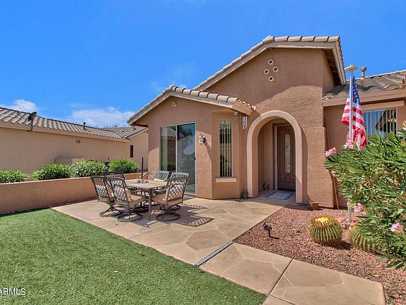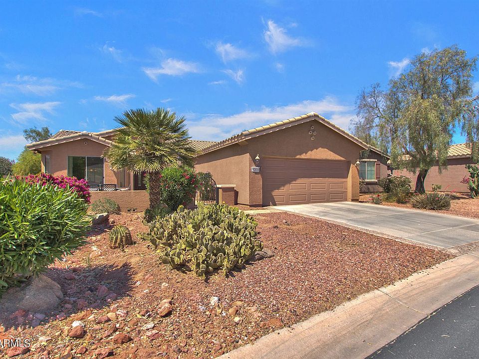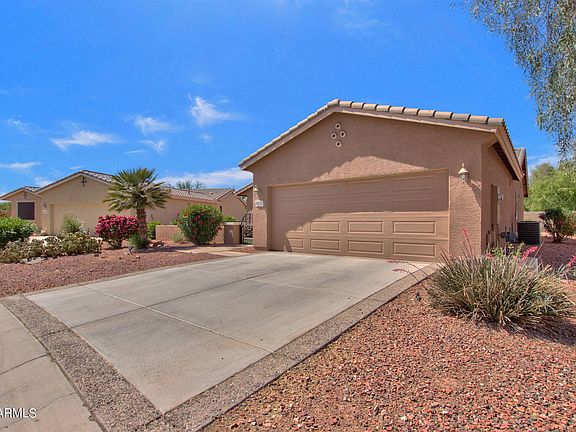 This Guard gate community is wonderful for this 2bed +den and 2 bath that has many extras. Bright throughout with natural light, the kitchen has a sit up bar, island and patio doors to the front patio. Stainless steel appliances that all stay and tiled counters. There are patios on the front and back of the home for outdoor entertainment. The home has tile flooring throughout, so no dusty carpets! Master bathroom has double sinks, walk in shower and walk in closet and a separate room for the toilet. Inside laundry room is spacious with plenty of storage. For the buyers with large trucks or golf carts, there is an extended garage in length and height. You will be near by a pond with a bench and many many Club house amenities.Don't miss this opportunity!
