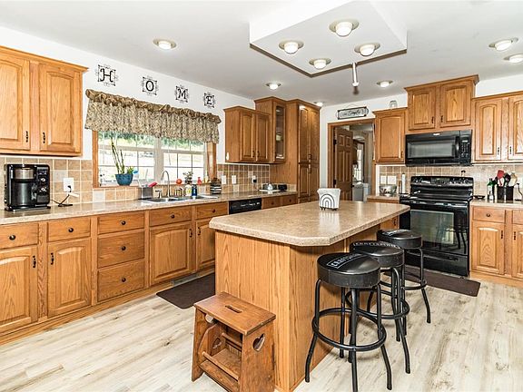 Beautiful open floor plan, divided bedrooms and over 2000 sq. feet on the main floor. Gorgeous kitchen with center island, black appliances, and double oven. Main floor laundry/mudroom is conveniently located right off the kitchen with an exterior door, no worries about tracking up the house with dirty shoes. This home has space for everyone with the 4 large bedrooms, main floor family room and living room as well as a rec/family room on the lower level. 2 full baths and 3 bedrooms complete the main floor. Downstairs you will find a full bath, a large bedroom, a man cave room and a rec/familyroom area. The lower level is a walkout that leads to a covered patio. This home is ideal for the large family and would be a great place to entertain or relax whatever your passion. This is a reverse ranch with all the privacy exactly where you want it. 2 beautiful patios, 20x50 pole bard with a garage door for all the toys you want to enjoy on your 1.23 acres.