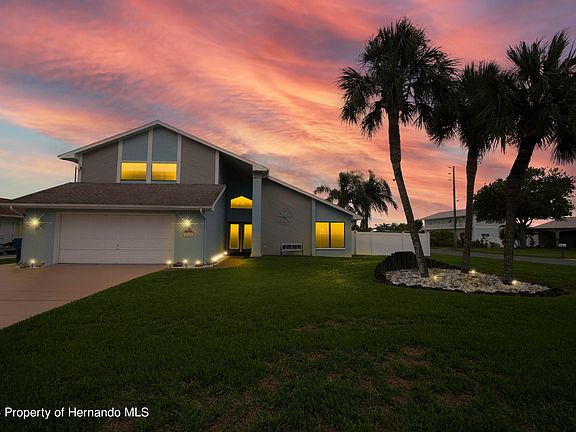 Discover your dream home on a deep canal with breathtaking water views and direct Gulf of Mexico access. This stunning property boasts an array of luxurious features designed to elevate your lifestyle. Outside, you'll find a detached utility building, an above-ground pool, and a privacy fence that create an inviting oasis. The expansive multi-tiered brick paver patio extends to a large wood dock, perfect for entertaining, with a spacious floating dock and boat lift making waterfront activities effortless. Inside, the home is filled with modern conveniences and elegant details. The first-floor Florida Room offers panoramic views, with a balcony above accessible from the primary bedroom. Two new HVAC systems and a new water heater ensure year-round comfort. The newly remodeled kitchen features solid surface countertops and new stainless-steel appliances, making it a chef's delight. The entry foyer, with its beveled leaded glass entrance and soaring 17.5-foot ceiling, sets a grand tone upon arrival. The first floor also showcases new LVP flooring, a remodeled full bathroom with a stall shower, and a Murphy bed in the family room for added convenience. The primary bedroom suite includes a beautifully remodeled bathroom, offering a private retreat. Upstairs, one of the guest bedrooms also features a Murphy bed, providing flexible sleeping arrangements. The open floor plan highlights a vaulted wood-beamed ceiling in the living and dining rooms, creating an airy, spacious feel. Two sets of sliding glass doors lead to the first-floor Florida Room, while additional sliding glass doors from the dining room open to the stunning rear yard and its many amenities. Notably, the home includes a convenient half bathroom, designed to service the outdoor amenities, which is accessible from the exterior just outside the dining room. The architectural shingle roof, replaced in 2013, remains in excellent condition, ensuring long-term durability. This home perfectly blends modern upgrades with charming details, offering a truly exceptional living experience. Embrace waterfront living at its finest in this exquisite property.