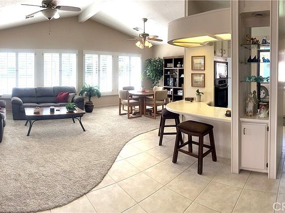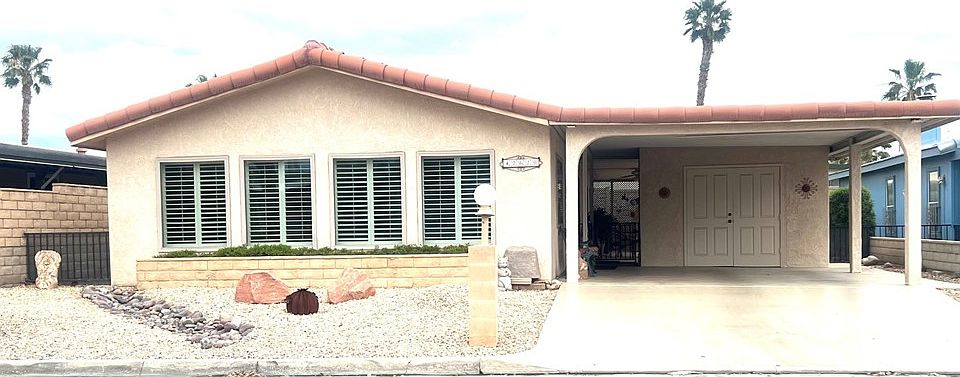 Home includes; custom window shutters throughout, ceiling fans, stucco exterior, 433A foundation, large enclosed covered patio, storage for a golf cart and covered parking. YOU OWN YOUR LAND! Walk to Clubhouse incl. Pub, Billiards, Pool w/Jacuzzi, Gym, Library, and Golf (incl in HOA dues). Short drive to El Paseo, Restaurants, Shopping, Eisenhower Medical Center, Acrisure Arena, and future Disney development! 55+ community