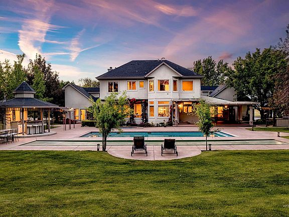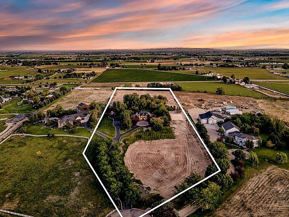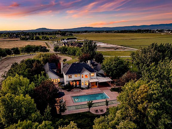 Extraordinary estate poised on 10 acres w/ captivating views in every direction! A private majestic retreat positioned at the end of the cul-de-sac w/ tranquil setting that is greeted w/ a long tree lined driveway, entrance waterfall & stream. Meticulously maintained w/ an impressive architectural design highlighted by 8800 sf of living space w/ two houses in one! An impressive finished garage & detached shop includes over 3,100 sf of garage space for 12+ cars & toys! Entertainers oasis w/ a heated pool, cabana w/ bath, .70 acre bass pond, sand volleyball court, bocce ball, covered patio & plenty of room for horses/animals. Elegant home includes grand entrance, hardwood floors, 4 fireplaces, wood built-ins, multiple bonus rooms & multiple living areas for endless options. A main level apartment/mother in law quarters includes private entrance & garage- 2 beds/1 bath w/ living room + full 2nd kitchen. Property has the potential for an additional 5 acre building lot at the south of the property thru Ada County.