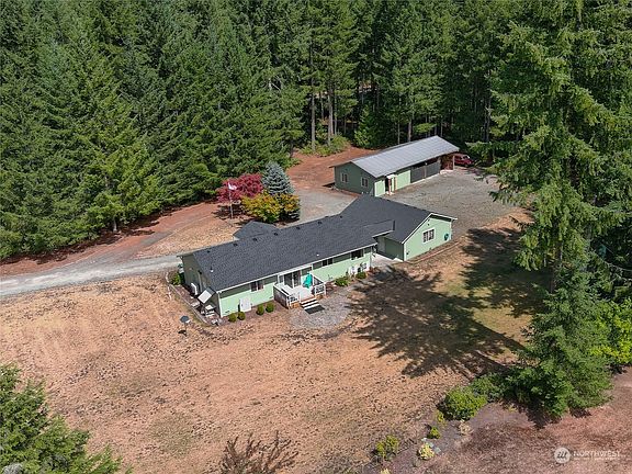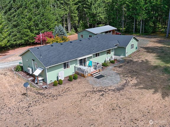 Come see this amazing opportunity to own a quiet & level, 2.6 acre lot, with beautiful buffering trees! This is a one story home with detached garage AND separate shop. Kitchen is large galley style with additional eating space. Primary bedroom features a private 5 piece bathroom. New roof on home & garage. New flooring. A/C-heat with super efficient mini-split wall unit. Soaking tub w/shower attachment in the hall bathroom. 80 gallon new water heater installed. There is a BIG yard for gardening, or entertaining. Room to park large vehicles, RV, boat. Hardwired for Generator at the house ( runs gas or propane). Be one of only four homes on this shared, dead-end, private road! This mountain view is spectacular. Easy commute, close to town!