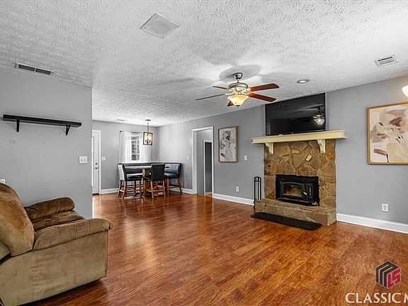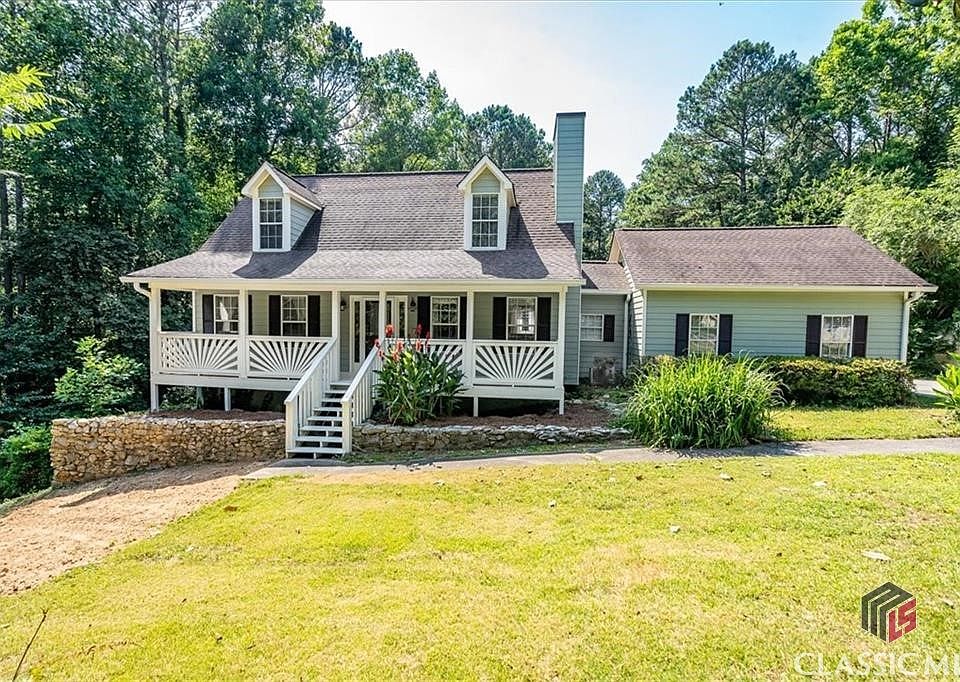 Situated on a private 2-acre cul-de-sac lot, this charming Cape Cod home offers tranquility and generous living spaces. With 3 bedrooms and 2.5 baths, it features a welcoming rocking chair front porch and a garage cleverly converted into a spacious den, game room, or flex room, equipped with a mini split system for year-round comfort. Should you decide you would rather have the space as a standard 2-car garage, the seller will convert the space back. Inside, the open Family Room showcases hardwood floors and a beautiful stacked stone fireplace with a wood burning insert, seamlessly flowing into the breakfast area. The kitchen is equipped with stainless steel appliances, a pantry, tile backsplash and white cabinetry—all appliances are included with the property. The master bedroom, conveniently situated on the main level, comes furnished with a wall-mounted TV and leads to an ensuite master bath featuring a large garden tub and separate shower. Upstairs, two additional bedrooms share a full bath. A highlight of the home is its inviting basement, featuring rustic wood walls, an impressive wet bar, and a second refrigerator, perfect for entertaining guests. Outside, a spacious back deck offers serene views of the yard, while a 24x32 outbuilding provides ample storage or workshop space. Located within the Loganville School District and free from HOA restrictions, this property combines comfort, versatility, and peaceful surroundings, making it a perfect place to call home.