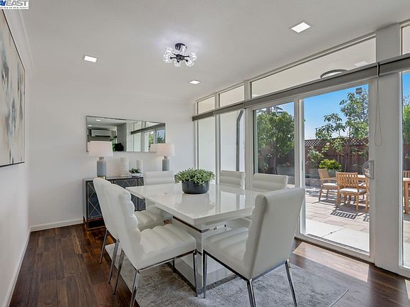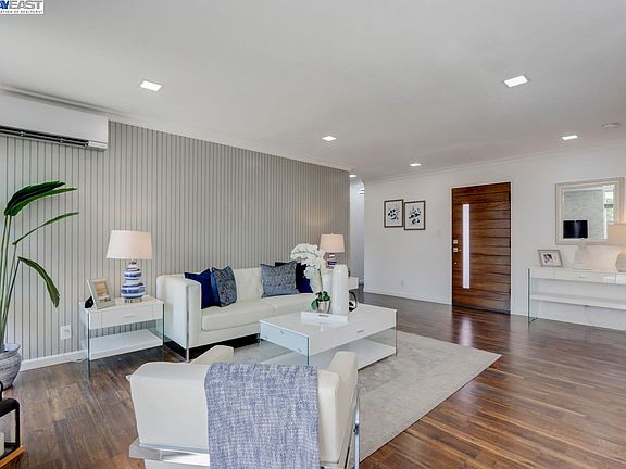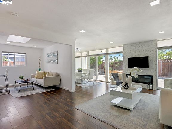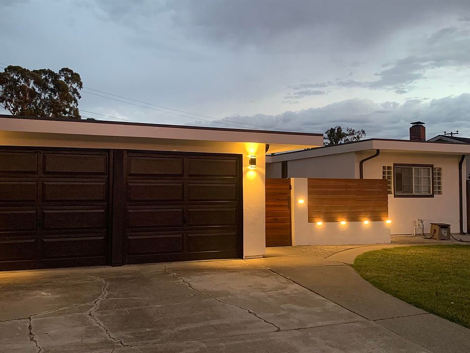 This modern fully remodeled, energy efficient Eichler style home boasts a chic open-concept floor-plan that pairs seamlessly with unparalleled designer touches, details and over 250k worth of upgrades. The home offers a spacious living room with a contemporary fireplace, laminate flooring throughout the house, fresh modern paint on the exterior and interior, newly remodeled gourmet kitchen with new custom European style cabinets, pull-outs, pantry, sleek gray countertops, stainless steel appliances, designer led lights, chandelier, ceiling-to-floor glass windows with views of backyard and Calaveras hills. Bright bedrooms with updated bathrooms and custom closet cabinets. Garage is fully insulated and finished with epoxy flooring and smart garage doors. Newly installed smart Wi-Fi enabled heat pump HVAC, a modern atrium/courtyard with finished modern porcelain pavers. The backyard is completely finished with lemon, cherry, peach trees etc., and has a gate which opens into Rix Park. The side yard has a shed for overflow storage. This elegantly upgraded property with no neighbors behind is waiting for you to call it Home!