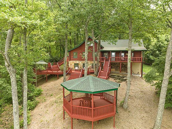 CUSTOM BUILT TRUE LOG CABIN is a mountaintop retreat! 5br/3ba on 5.34 acres. Incredible view extends 75mi NW to Cumberland peaks, watch sunsets, Dollywood fireworks from back porch. 3 levels. Vaulted ceiling, stone woodburning fireplace in living room. Extensive decking, huge gazebo to watch bears & wildlife in surrounding park-like woods. Landscape lighting illuminates drive, tree canopies & cabin for magical evening atmosphere. 2-car garage with large shop. Storage shed and carport. Property sits at the end of a dead end, county-maintained paved road and convenient to Sevierville, Pigeon Forge and Gatlinburg.