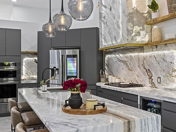 A Masterpiece of Modern Luxury! This exquisite home is a true standout, boasting premium upgrades and thoughtful details throughout. Step through the frosted entrance glass door and into a world of elegance. With impact windows and doors, glowing turf stone pavers in the front and rear, and LED accent lights, this home exudes curb appeal day and night. Outdoor Oasis: Entertain and relax in your personal paradise, featuring an outdoor shower, two gas-powered fire pits, a hot tub spa, and a projector screen for outdoor movie nights. The side-load garage and durable metal roof complete the exterior's sophisticated design.Gourmet Kitchen:The chef's dream kitchen boasts:Custom exotic marble counters and backsplash with LED lighting.Double islands featuring continuous waterfall Soft-close cabinets and upgraded custom lighting enhance the space's modern feel