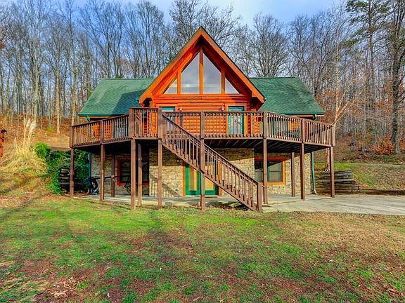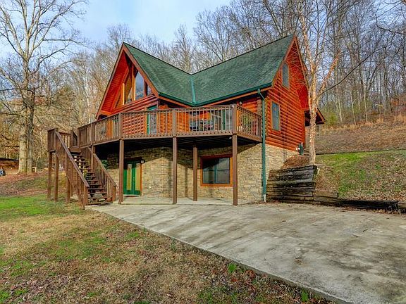 This beautiful log Home was built in sits on 2 acres, backs to 300 acres. Very private, Open floor plan with Cathedral ceilings in Great Room. Loads of natural sunlight. Gas stone fireplace w/wood floors opens to Kitchen/Dining. Kitchen has island and Stainless appliances. Master has own bathroom complete w/whirlpool tub. Lower level offers large Rec Rm., office space and playroom or 4th BR with own full structure stays as does the storage building and chicken coops!