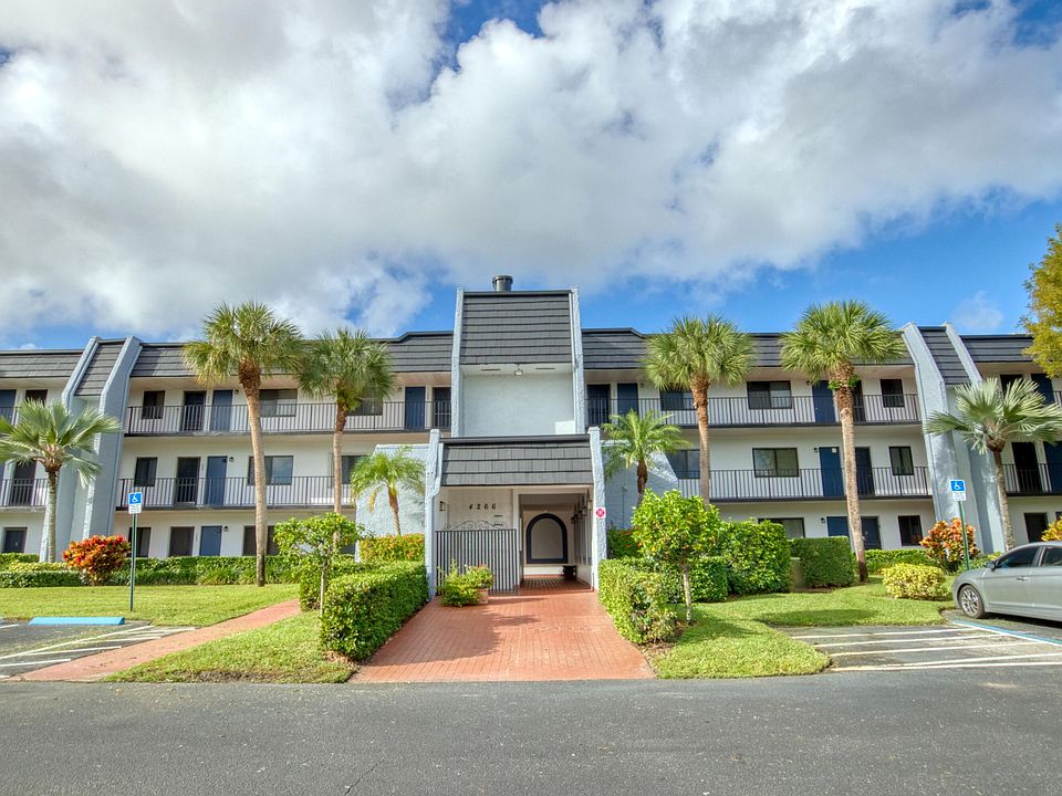 Carefree Seasonal Retreat or Easy Full Time Living. Complete Remodel! Expanded open kitchen with custom all wood cabinetries. One Foot Lip on Quartz Marble Countertop for quick dining (3 Stools). Updated General Eletric Panel supplying all new custom light fixtures. Full size washer/dryer vented to the exterior. Waterproof, Scratch & Stain Resistant Hickory Millport Laminate Wood Floors throughout. All new modern baseboards, paint, and smooth ceilings throughout. Two Walk-in closets measuring (7 x 6) & (5 X 4). Screen enclosed patio/Florida Room (14 X 6) with new ceramic tile. Monthly fee includes Digital Cable, Wi-Fi, Water, Exterior Insurance & Matenience, Pool Service, Elevator Service, Manned Gate and Security Patrol. Centrally located, Close to Turnpike, Wellington, PBI Airport