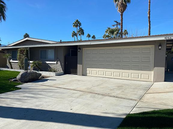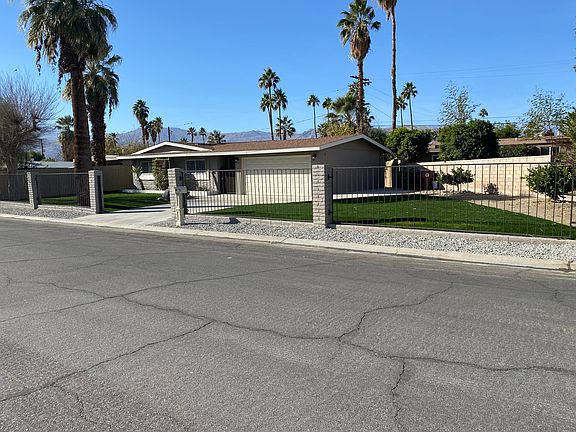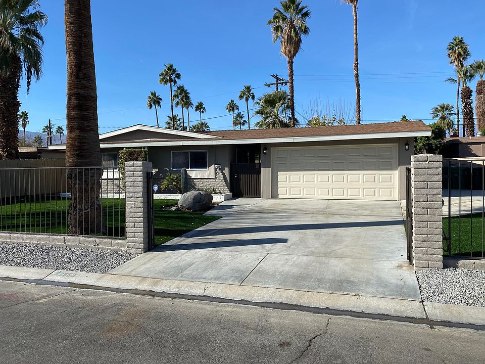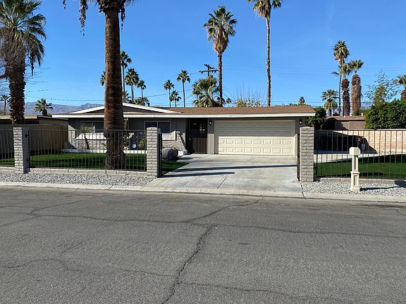 Nicely updated home in the heart of Palm Desert and just walking distance to the high school. This 3 bed 2 bath home features a new roof, new landscaping in front and back, fresh interior and exterior paint, new wrought iron privacy gate, new garage door with smart/wifi garage door opener, new exterior lights with light sensors, new carpet, remodeled bathrooms, new water heater, toilets and vanities, new faux blinds in bedrooms, new light and plumbing fixtures, new electrical switches, and new kitchen sink. I may have left something out but it's a must see property. Enjoy the gorgeous mountain tops and back yard views from the comfort of your dining room and kitchen area as depicted in the photographs. Just outside the back gate a large community pool awaits you for self-enjoyment without the headache of pool maintenance and extra homeowner's insurance and/or pool repairs. The pool is shared by only 14 homes.