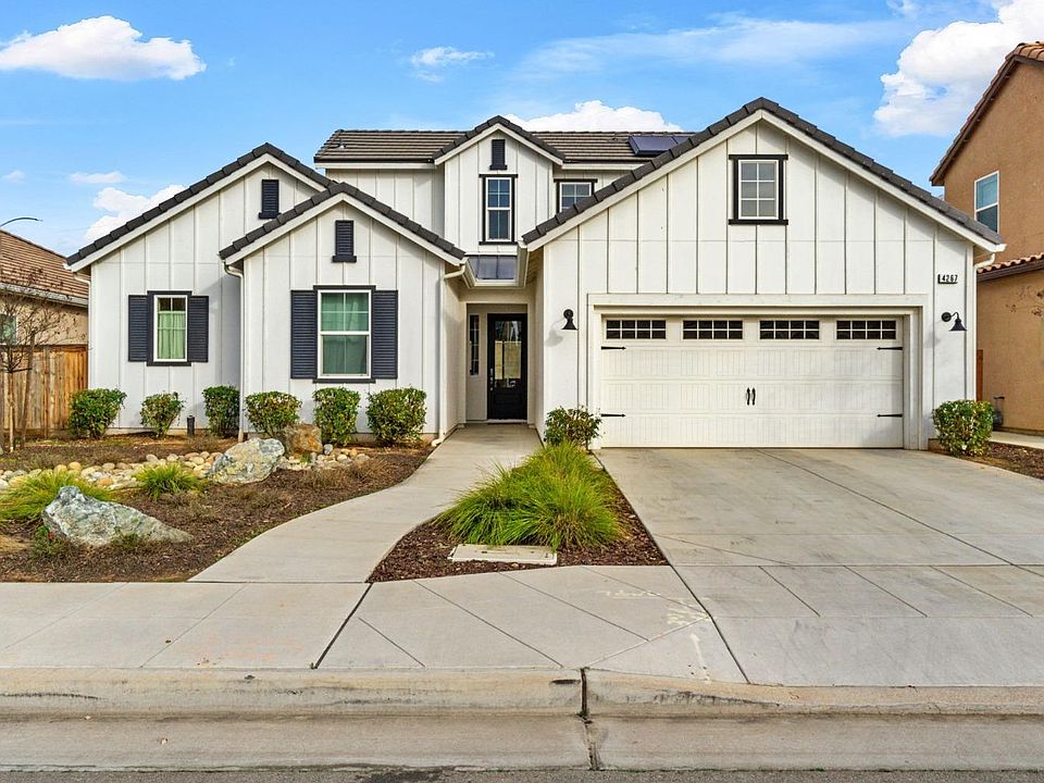 This former builder Model residence, featuring over $120,000 in upgrades, offers luxurious living across 2 spacious stories. With 4 bedrooms, 3 bathrooms & nearly 2,700 square feet of opulent space, it's a haven for discerning homeowners. Upon entry, tall ceilings and upgraded wood-like tile flooring set an elegant tone, flowing into a multi-purpose/formal dining area adorned with floor-to-ceiling shiplap. The expansive great room boasts bold wooden beams, a gas fireplace with a stone mantle & custom cabinetry/entertainment center. The gourmet kitchen features contemporary white cabinets, pearl white Quartz island/countertops, and upgraded GE Profile stainless steel appliances, complemented by a walk-in pantry and versatile butler's pantry. Two guest rooms on the primary level offer upgraded carpeting, baseboards & a guest bathroom with Quartz counters & modern tile flooring. The owner's suite exudes luxury with large picture windows, custom barn doors leading to a lavish bathroom with expansive Quartz counters, double sinks, upgraded hardware & a walk-in shower with double showers. Upstairs, a spacious loft or second family room, a separate bedroom with a private upgraded full bathroom, and enhanced security features including a solar-powered security system and exterior floodlights with motion sensors await. Located near FSU, Fresno Airport, SaveMart Starbucks, Sierra Vista Mall, Costco & other dining and shopping options, this home offers tranquility and convenience.