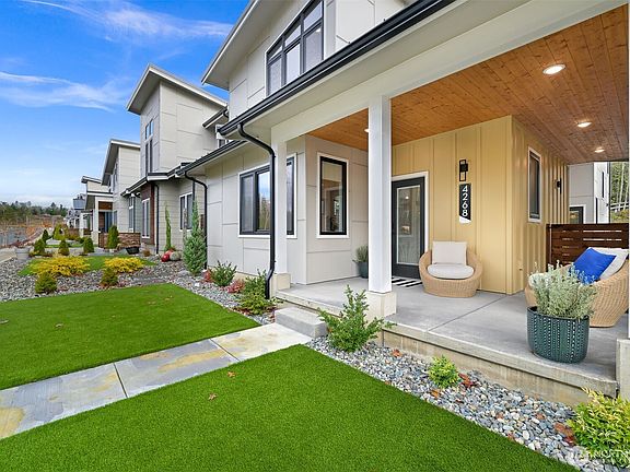 Experience the blend of elevated style and functionality where modern design meets environmental stewardship. Like-new home showcases sophistication and thoughtful layout with an open floor plan. Stylish kitchen complete with a central island + quartz countertops flowing effortlessly into the living area with its inviting fireplace. Step through modern French doors to a covered breezeway patio perfect for year-round enjoyment. Private backyard oasis features a 6-foot fence, chic modern pavers, low-maintenance turf and raised bed planters. Upstairs the primary suite offers a retreat with an attached ensuite and walk-in closet complemented by 2 bedrooms sharing a full bath. A detached flex room adds versatility to this home + 2-car garage!