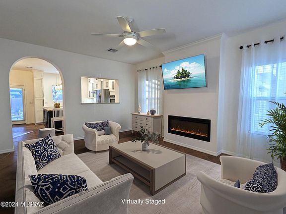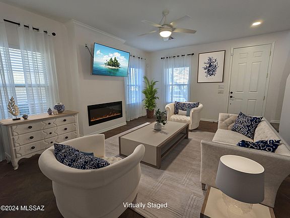 The 9 ft ceilings and exceptional renovation set this home apart. 4 BD, 2 1/2 BA, 1634 sq ft home. See full description below. Cook's Kitchen w/new white shaker cabinets & hardware, quartz countertops, large island w/butcherblock top, pendant lights. SS appliances. GE Cafe gas cooktop exhaust hood, refrigerator w/ice maker, KitchenAid DW, wine cooler, insta-hot faucet, GE Double ovens & microwave. Energy Star 16 Seer HAVC new 9/24. Energy efficient -custom radiant heat barrier at roof, double paned, low-E windows, new tankless water heater, new programmable Smart thermostat, new LED fireplace. Powder Room/Laundry Closet was a custom, builder alteration. New 11' x 14' steel gazebo w/ curtains. Freshly painted inside & out. Higher garage. Near recreation, Splash Pads/Pools and Fitness Centers Bright and airy 4 Bedroom, 2 ½ Bathroom, 1634 sq ft home, in highly desirable, Riverhaven neighborhood with 9 ft ceilings over entire first floor, Taller garage, porcelain tile floors in all bathrooms, kitchen & living room, has Leviton rocker plate switches and outlets and has been renovated and freshly painted inside & out. Cook's Kitchen w/new, white shaker cabinets, modern hardware, professional style SS sink w/touchless faucet, "Aria" quartz countertops, trash pull-out, pass thru to Living Room, large island w/butcherblock top, pendant lights, Smart outlets, and oversized walk-in pantry w/lots of shelves under the stairs. Dining Area has new, farm house chandelier. Appliances: GE Café gas cooktop w/new outside venting SS exhaust hood, 2-year-old Frigidaire armoire SS Refrigerator w/ice maker, new Electrolux dishwasher w/SS interior, wine cooler, insta-hot faucet, new GE Double ovens: 1 electric convection, 1 microwave. Energy Star,16 Seer Refrigerated Central AC & Heating System 9/24, additional energy efficient features include custom radiant heat barrier, double paned, low-E windows w/solar film on those facing south, new tankless water heater, new programmable, Smart thermostat, new LED fireplace w/remote & optional heater and new LED can lights. Interior improvements: New closet doors all (4) bedrooms, French double doors w/window blinds, Trafficmaster Berber carpet in all the bedrooms & stairwell, New high end faux wood blinds on all windows, New Craftmade ceiling fans w/dimmable LED lights, adjustable fan speed in all rooms & all new air registers. Framed, 55" Smart TV above fireplace conveys. Powder Room/Laundry Closet was a custom, builder alteration to the standard KB Homes, Catalina Floorplan that did not have a downstairs bathroom. Laundry has dual fuel connections. New Storage cabinets, New toilet and new vanity with touchless faucet and LED mirror were part of the recent renovation. Upgrades to All (3) Bathrooms: New chair height toilets, Dual shower heads, Double sink vanity in the primary bathroom with marble top & new Faucets, New matching vanity in hall bathroom, New vent fans w/LED lighting, Framed LED Bathroom mirrors, modern LED light fixtures, New wood framed medicine cabinets & toiletry storage wall cabinets. Security & Safety Features include: New smoke and carbon monoxide detectors, ADT alarm system--equipment paid for; transferrable monitoring, Motion sensor lighting at front & back porches and driveway, stylish heavy aluminum security door, New insulated garage door, Nickel Microband door hardware throughout, and New water softener. Backyard features: Two mature mesquite shade trees, New 11' x 14' steel gazebo with curtains, mosquito netting & lighting. Room for a garden, play equipment or shed. LOCATION, LOCATION, LOCATION... Nearby (within one half to 2.5 miles) numerous outdoor Recreation, Splash Pads/Pools and Fitness Centers: The Loop @ Columbus, JCC, Smiling River Dog Ranch, Dog Park, George Mehl Foothills Park, Rillito River Park, Brandy Fenton Memorial Park, Lighthouse YMCA, McCormick Park Multiple Public, Charter/Magnet, Alternative, Parochial and Private Schools (w/in 5 miles): Nursery/Elementary Schools: Davidson, Desert Sky Community, Academy Adventures, BASIS Primary, Khalsa Montessori, Tucson Waldorf, Faith Lutheran & St. Cyril of Alexandria, Carden Christian, International School of Tucson, Tucson Hebrew Academy, and others Middle Schools: Doolen, Adventure Schools Mid Town, Dodge Traditional, Tucson Waldorf, Castlehill Country Day, BASIS Tucson North, Khalsa Montessori, The Gregory School, St. Cyril, Faith Lutheran, Carden Christian, Tucson Hebrew Academy and others High Schools: Catalina, University HS, Tucson High Magnet School, Presidio HS, BASIS North, Desert Sage HS, Southern AZ Community, Edge HS, Pima Partnerships, ACE Charter, Salpointe Catholic, Tucson Prep, The Gregory School, and others Pima County Community College, Downtown Campus Close (within 10-15 minutes) to: University of Arizona main campus, U of A College of Nursing, James E. Rogers College of Law, Banner University Medical Center, Tucson Medical Center, Tucson Dental Assistance School, UofA School of Veterinary Medicine (15 miles, north), VA Hospital (10 miles, south) Central (within 10-15 minutes) to Shopping: Tucson Mall, Park Place Mall, El Con Mall, Costco, Lowe's, Sprouts, Trader Joes, Whole Foods, Ace Hardware, Broadway Center, Walmart Neighborhood and Supercenters, La Encantada, and more! Not Far (20-30 minutes) to: Tucson International Airport, Marketplace at The Bridges, Davis Monthan AFB