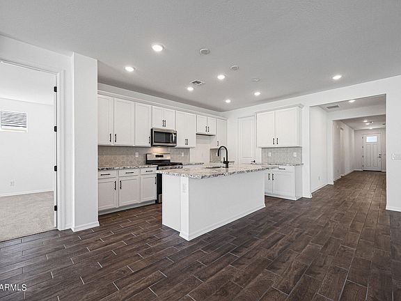 This beautifully upgraded homes comes with four bedrooms all featuring spacious walk-in closets as well as a multipurpose flex room. Upgrades include wood-look tile in all the common areas with upgraded carpet in bedrooms. Custom kitchen backsplash with granite countertops and stainless-steel appliances. White shaker cabinets and matte black hardware complete the updated design.