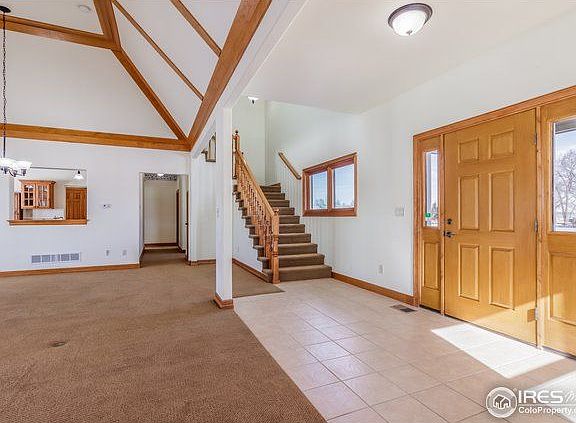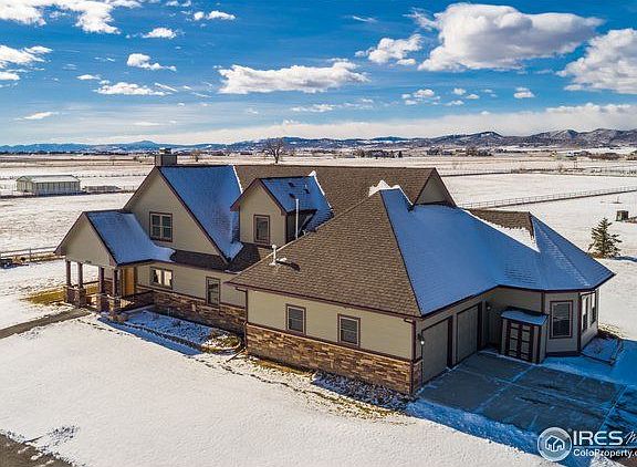 Rocky Mountain views! Custom home on 2.4 acres w/amazing mountain views near Lonetree Reservoir & the new TPC golf course. Soaring ceilings in the open living area w/copious amount of windows. Fireplace in wall of stacked stone. Kitchen has eating nook, gas stove, dishwasher & antique Hoosier. Tiled dining room /office leads to owners suite w/dresser nooks, walk in closet, clawfoot tub & shower. Oversized 2 car heated garage. Move to the country w/town minutes away! Room for BIG shop.