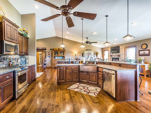 Luxury high-end custom home located on 2-acres in Pottawatomie County. Built by D & R Construction, this ranch-style home has 3 bedrooms + 3 full bathrooms and is full of incredible upgrades. The spacious living room offers real hardwood floors, vaulted ceilings and is anchored by the beautiful gas fireplace. It also opens nicely to the stunning kitchen. Beautiful granite covers the counter-tops, alongside lots of walnut (Custom Wood Product) cabinets and a walk-in pantry. Step outside to the generous east-facing covered deck to overlook the stunning pool (built in August 2017). As you make your way to the lower level, you'll be blown away by the spectacular family room. Your very own home theater room, pool table space & finishing with a wet-bar. Outside the lower-level walk-out, you can spend your days at the pool and evenings by the custom built fire-pit. Included in the house is also a detached 30x50 shop. Tons of space for all the toys and an office area.