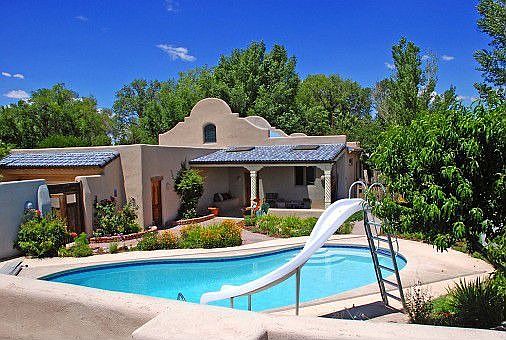 In the heart of Los Ranchos, Enchanting Adobe with craftsman features throughout, Enjoy cool swimming pool in summer and warm kiva fireplaces & radiant heat in winter. Solar panels send power back to electric co. Walk through the beautiful gardens and Outdoor entertaining areas with covered patios surrounding the home! Hand carved beams & posts and nichos everywhere. Big windows open the home to out of doors. Home sits on/near irrigation, back yard even has a rec court. Please contact Cathy Andersen (505) 450-2168 or Deb Vickery (505)554-7512 for more information on this Custom Home with a Pool, in the North Valley of Albuquerque.