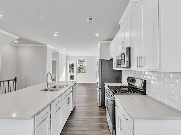 The second floor boasts an open-concept living area with elegant LVP flooring and large windows that fill the space with natural light. Off the dining area is a convenient half-bathroom, ideal for residents and guests. The chef-inspired kitchen includes a versatile granite-topped center island, plenty of cabinet space, and a full suite of stainless steel appliances, including a new refrigerator. Balcony overlooking the pond