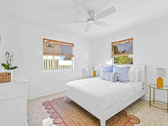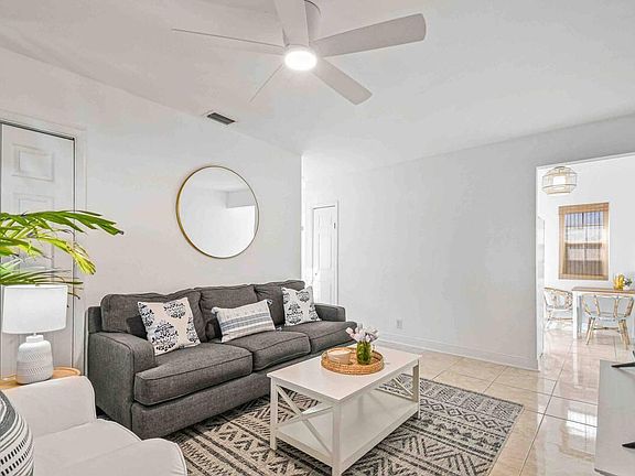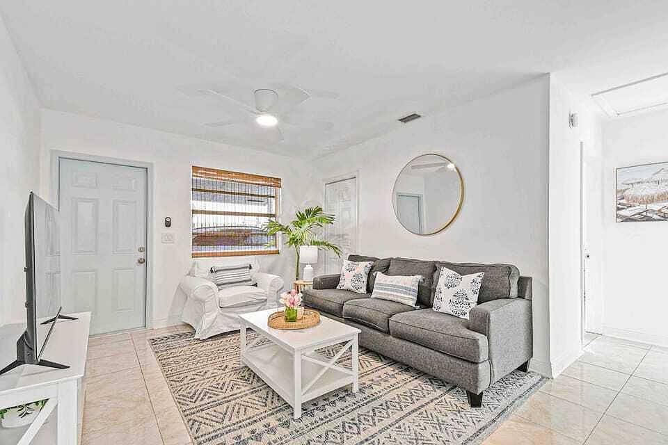 This quaint 2 bed/1 bath is ideally situated just minutes from Palm Beach Island and downtown West Palm Beach! This fully furnished apartment just underwent a full renovation and offers a light, bright, and beach-y feel with fully renovated bathrooms and a porch. The space is beaming with natural light and equipped with everything you need including Wi-Fi, 50'' Smart tv, cookware, towels and more. Unit is available for as little as 7 days!