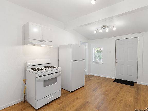 Built in 1922 and thoughtfully updated, this single-family residence offers approximately 768 square feet of living space on a 0.115-acre lot. The property features 2 bedrooms, 1 full bathroom, a covered front porch, and a fenced backyard with mature trees. The interior offers an open-concept layout with vinyl plank flooring throughout, fresh interior paint, and updated ceiling fans in the living room and bedrooms. The living area includes a new AC window unit with heating capabilities. The kitchen has been renovated with a new gas stove, refrigerator, updated cabinetry, and a decorative tile backsplash. A separate utility room accommodates a washer and dryer setup. Each bedroom includes an individual AC window unit and a ceiling fan for climate control. The bathroom features new fixtures, a shower/tub combination, vinyl flooring throughout the home. The exterior includes a driveway and additional front parking space. Located near Woodlawn Lake, San Antonio College, San Pedro Springs Park, major highways, and downtown San Antonio, the property offers convenient access to shopping, dining, and recreation. The property will be sold as-is.