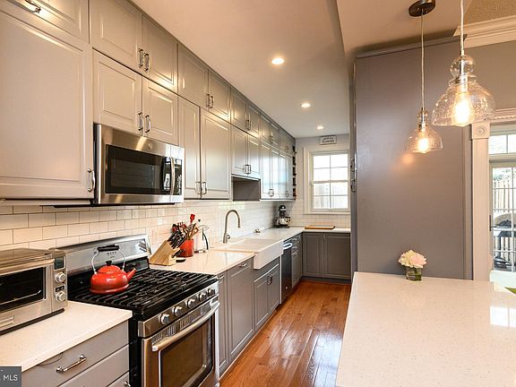 Fantastic updates to this spacious row home - open first floor plan with living room, renovated kitchen with gray cabinets, quartz counters, and stainless steel appliances, island with seating, open to dining room and sunroom. Sunroom has large french doors opening to a trex deck, flat back yard, off-street parking and garage door entry. Upstairs, there are three really generously sized bedrooms and two full baths. The basement has a wetbar with a full-size fridge, family room, additional bedroom, large, walk-in storage room, laundry/utility room & full bath. Updates include solar panels, new fence, updated hardwood floors, renovated kitchen, insulation in attic, all new windows, updated roof, and more!