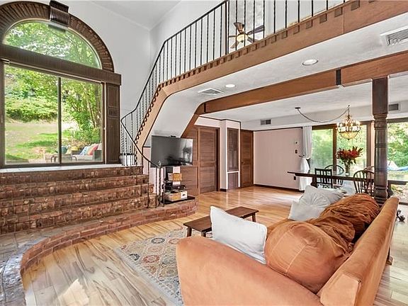 Charming brick Tudor in the heart of Sunset Hills. This two-story foyer welcomes you to a modified floor plan with attractive architectural details, including a rear addition with a two-story brick wall, fireplace, and back staircase to the second floor with barreled wrought iron railing, overlooking the family room. Hardwood floors in the original construction, living room with crown molding, and open staircase to the basement, equipped galley kitchen with a cozy breakfast nook and bar seating, opens to the amazing great room with access to the outdoors through three separate sliding doors. The second floor offers three spacious bedrooms three full baths, a gorgeous beamed cathedral ceiling, access to the upper deck off the master bedroom. Enjoy entertaining, picnics, dining al fresco three seasons of the year from the private wrap-around brick patio, campfires at the firepit in the back yard, or morning beverage off the master bedroom. There's so much potential!
