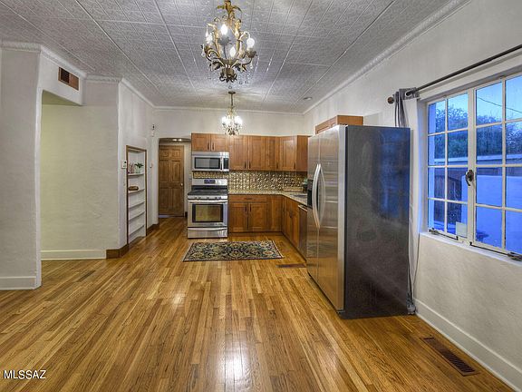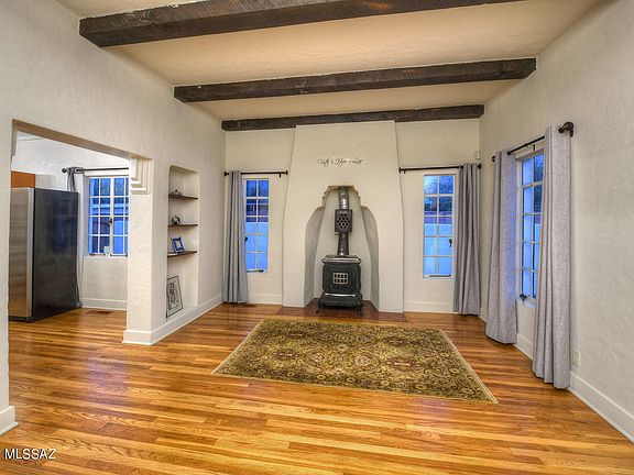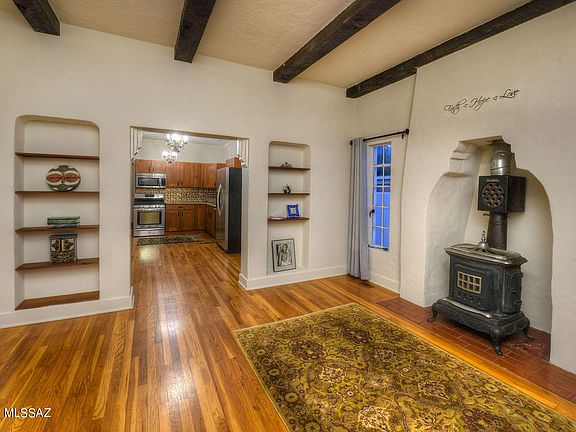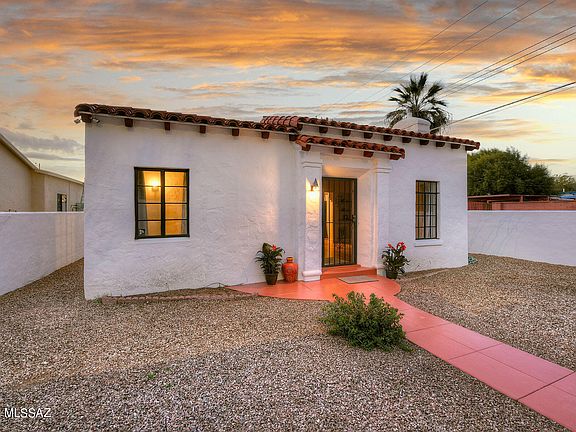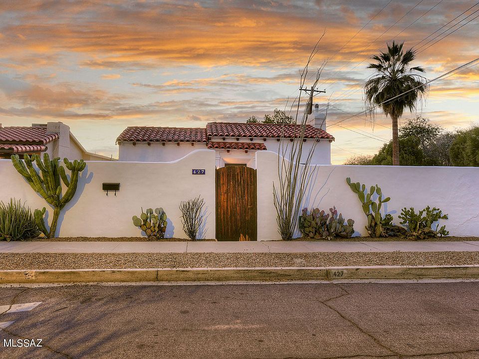 Sam Hughes Spanish Mission home originally built in 1936.Beautiful hardwd flrs & colored concrete flrs, hi,wood-beamed ceilings in the living rm, w/ nichos & heatilator opens to updated & remodeled kitchen with large eat in area. Unique punched metal ceiling & backsplash,vintage main bath has new vanity. 2nd bedrm has sittingrm/office or could be used as a den. Sep downstairs bedrm has separate entrance & ensuite Jack & Jill bathrm perfect for sharing or using as office. Backyd has BBQ, concrete patio, large carport, extra storage & separate gst home. Gst hse has garage style patio dr, colored concrete flrs, laundry,1 bedrm,1 bath & kitchen w/granite counter tops.The home & property is surrounded by a large masonry wall w/ electronic gates & privacy! Off St parking! walk to Flora's.