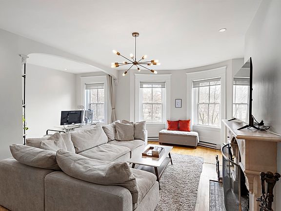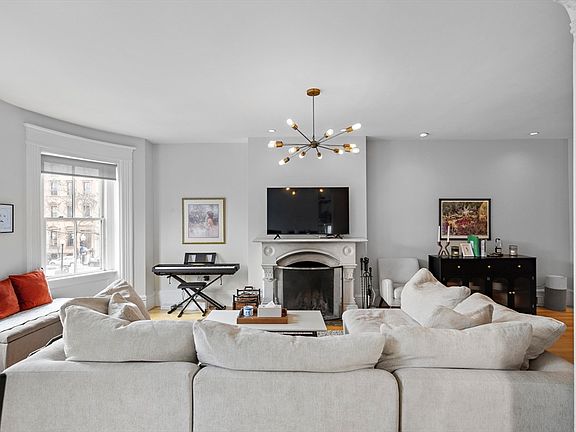 Overlooking Blackstone Park through oversized windows, this second-floor-through condo wows in scale and style. A sprawling, sun-drenched, and south-facing living/dining space offers soaring ceilings, a working wood-burning fireplace, and a large nook perfect for an office or library. A lovely kitchen, featuring a Viking Range, paneled Sub-Zero refrigerator, pot filler, and slate countertops, can be closed off to the living area with pocket doors or left open while you're hosting the party of the year in this palatial space. The primary bedroom features a large closet and opens to a fantastic private deck, while the remodeled bathroom offers a Jacuzzi tub, storage, and a rainfall showerhead. A second bedroom with built-ins and a third fireplace also features a large closet. This home conveys with a single, direct-access, gated parking space nicely finished with pavers.