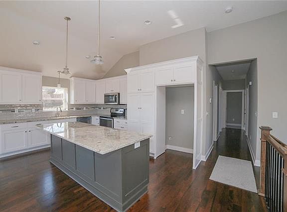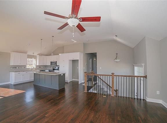 Beautiful new split entry home. This 4 bed/3 bath won't disappoint with high vaulted ceilings, custom cabinetry, hdwdfloors, over-sized kitchen island, granite counter tops thru-out, walk-in tile shower in mstr & large main floor laundry rm!2nd fam rm, 4th bdrm & full bath on lower level. 3 car garage! Community pool and walking trails. Heart of Raymore downthe street. 1 year builder warranty! Photos are of former model. Room sizes & taxes are estimated.