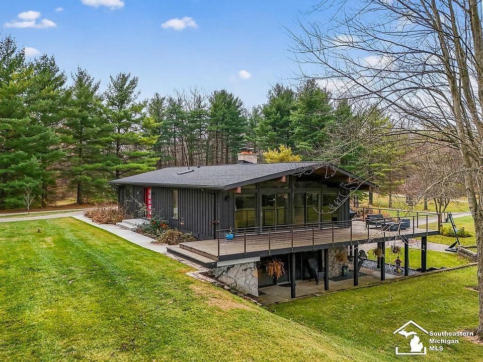 Stunning Mid-Century Modern Retreat on 15 Acres with Private Pond Access. Welcome to your dream home in Ottawa Lake, MI — a completely remodeled mid-century modern estate set on 15 picturesque acres with access to a private, shared 5-acre pond. Thoughtfully updated in 2022, this property blends timeless design with modern luxury for the ultimate retreat. Step inside to find a custom-designed kitchen featuring Sub-Zero and BlueStar appliances, sleek cabinetry, and elegant finishes perfect for both entertaining and everyday living. The open-concept layout flows seamlessly into spacious living areas adorned with rich hickory flooring throughout, highlighting the home’s warm and natural aesthetic. Enjoy the best of comfort and convenience with a Generac whole-home generator, Sonos surround sound system, and an EV charging station in the garage. Expansive windows offer serene views of the surrounding acreage and pond, creating a peaceful connection between indoor and outdoor living. Whether you’re sipping coffee on the patio, kayaking on the pond, or simply enjoying the privacy of your own 15-acre oasis, this home delivers an unmatched combination of modern elegance and tranquil country living — just minutes from the conveniences of town.