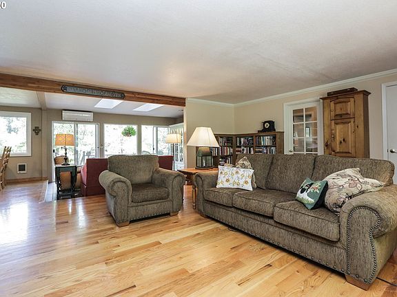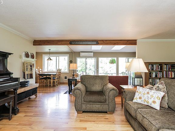Single level well maintained home located on a private lot, 1.5 level acres with 340 ft of Mckenzie River Frontage, panoramic hillside and river views. This home features beautiful hardwood floors, new dishwasher & fridge, open kitchen, enjoy river view from the sun-room w/wood fireplace, skylights, ductless heat pump .Opportunity for in-law suite w/separate entrance(buyer to do due diligence). RV Parking,shop w/covered area and chicken coop. Swimming and finishing hole located at bend in river