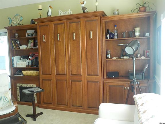 One of only three lovely efficiency units at The Gardens at Cypress Bay. This compact unit with private balcony, comes with custom Cherry wood 12 ft Murphy Bed unit complete with all built in electric fireplace. With cathedral ceilings, unit has full bath, plus efficiency kitchen and lots of closet space. Stackable washer/dryer is include too. Also comes with with dining table/2 chairs. Hunter Douglas window treatments also convey.