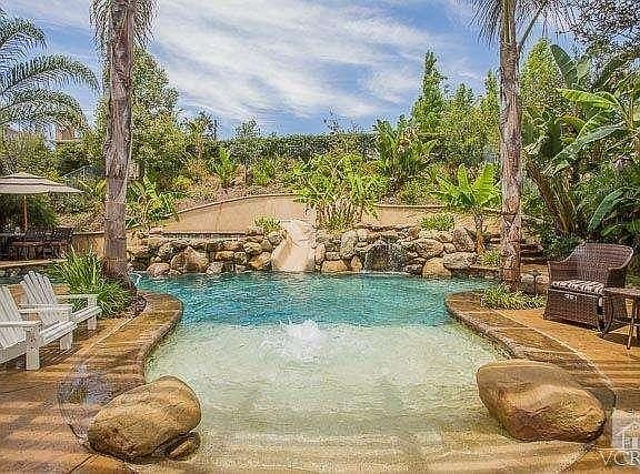 Just Reduced. Motivated Sellers. Move-In Ready. Stunning Sought after 5 Bedroom 3 Bath Home in Dos Vientos! Amazing Entertainers Resort Dream Yard! Private w/Lush Tropical Landscaping, Solar, Salt-Water Pool w/Beach Entry, Slide, Grotto w/Waterfalls. Built-in BBQ and outdoor sound system. Open Floorplan w/Cathedral Ceiling. Separate Dining Room. Beautifully upgraded with Travertine Floors, Designer Paint & Carpet, Custom Window Treatments. Large Family Room w/Fireplace adjoins Gourmet Kitchen w/Granite, Large Center Island, Walk-In Pantry. Downstairs Bedroom & Full Bath plus Bonus Room or 5th Bedroom. Office Nook at top of stairs w/built-ins & window seat. Spacious Master Suite w/Large Closet w/built-ins, Bath w/dual vanities. 2 additional Bedrooms with Custom Closets. Laundry Room w/granite counter tops. Garage w/Epoxy floors & built-in & overhead storage. Prime location on cup-de-sac, walk to Schools, Parks, The Village. Spectacular Home!