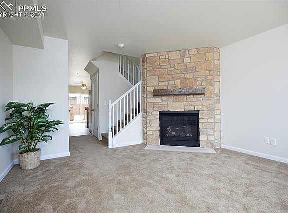NEW TOWNHOME Under Construction and Nearly Finished! 2 master bedroom suites plus a 13'x9' office with adjoining bathroom! Central A/C, cozy gas log fireplace and multiple ceiling fans combine for customized comfort at any time of the year! Kitchen features a breakfast bar, upgraded stainless steel appliances, large pantry closet and generous space for a dining table. In the the living room on the main level is an attractive stone-accented corner fireplace with mantle and a powder room/half bath in the hallway. Basement family room is 13x13 and a clothes washer & dryer are supplied in the laundry. Installed throughout the home is a fire suppresion system for added safety. Private fenced area in back includes n 11x8 deck, a bit of yard space and a storage closet. Enjoy the seasonal community swimming pool just a few steps from the front door. Convenient commute to Peterson AFB, Fort Carson & coming employment opportunities at Amazon! Less than 2 miles to I-25.
